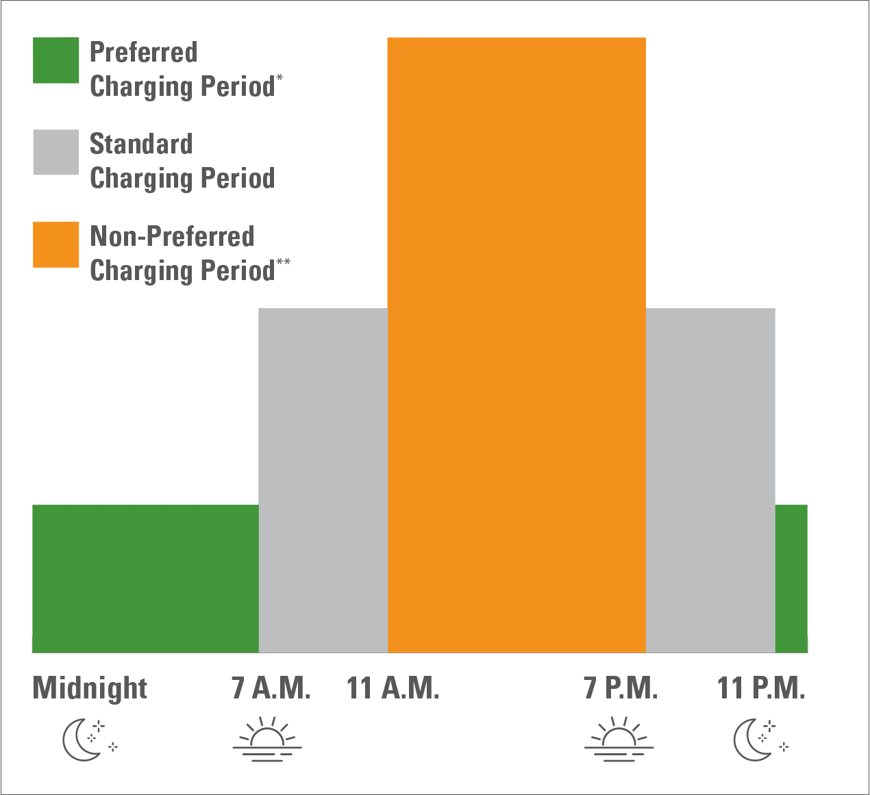 If you charge or use energy during the Standard Charging Period of 7 a.m. to 11 a.m. and 7 p.m. to 11 p.m., you will be charged at your standard delivery rate.